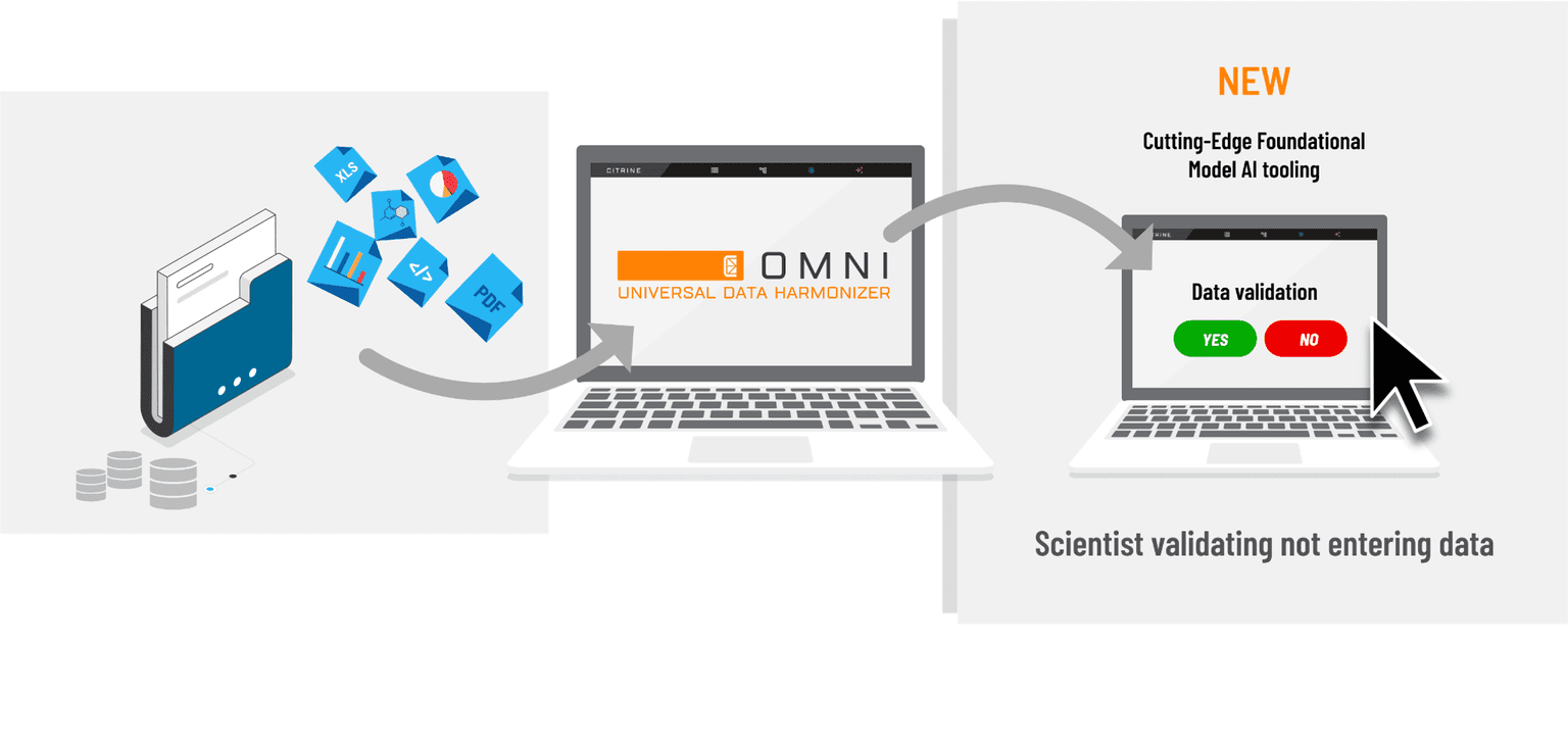 Omni 是一款通用数据整合器。它通过一个由 10 多个 AI 代理组成的团队,自动从任何来源(TDS、SDS、电子表格、报告等)导入数据,并将其放入一个“神奇的容器”中进行清洗和结构化处理,以便最终获得批准。Citrine 认为这项技术可以终结电子实验记录本——这种过时且笨重的技术耗费了科学家数百小时的时间,延误了研究成果的产出,打击了他们的积极性,并且无法保护知识产权。