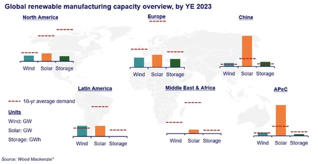该咨询公司表示,中国制造商正在瞄准具有本地含量要求的海外市场,以成为区域制造中心。 2019年至2023年期间,中国可再生能源产品出口增长了35%,Wood Mackenzie将其归因于“有竞争力的价格和产能主导地位”。