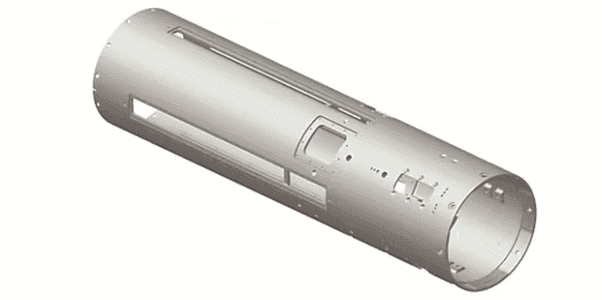 防空导弹弹身各舱内需要安装各类单机或设备,相邻舱段之间通过可拆装结构加以连接。防空导弹直径不大,舱体一般为整体式薄壁结构。所谓整体式结构,是从制造手段上区分于装配式结构,目前主要有厚壁管材或铸件机械加工、机械加工或化铣成型板材焊接、旋压成型等制造方法。按照承受载荷的主要受力元件不同,舱体可分为硬壳式与半硬壳式,其中,硬壳式结构主要由薄壁与起横向加强作用的隔框组成,没有梁、桁条等纵向加强件,各类载荷均由薄壁承受;半硬壳式结构同时还有梁、桁条等作为主要受力元件[2]。舱体内部需要提供各类设备安装支座,同时舱体表面需要提供各种开口,在开口较大部位一般增加补强结构,如图1所示。